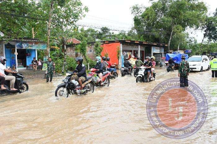 Air Hujan Meluap ke Jalan, Anggota Kodim 0802 Bantu Tertibkan Lalu lintas dan Seberangkan Warga yang Melintas