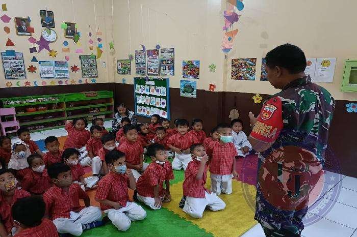 Dengan tekun dan penuh keceriaan, anak-anak TK itu menyambut Babinsa tepuk tangan sembari bernyanyi, dengan penuh antusias mendengarkan keterangan yang disampaikan oleh sertu Rochani.