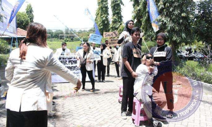 Mereka menggelar aksi teatrikal, memprotes kebijakan kampus yang memberikan sanksi berupa pengguguran nilai pada 2 mahasiswa yang tanpa izin merekam pembicaraan dengan Ketua.