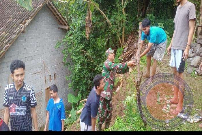 BOYOLALI lintasjatimnews.com – Babinsa Koramil 10/Sambi Kodim 0724/Boyolali Serka Sumadi bekerja sama dengan warga untuk memperbaiki talud rumah bapak Samin yang longsor akibat hujan deras di Dukuh Dakon Desa Jatisari Kecamatan Sambi Kabupaten Boyolali. Kamis (23/02/23)