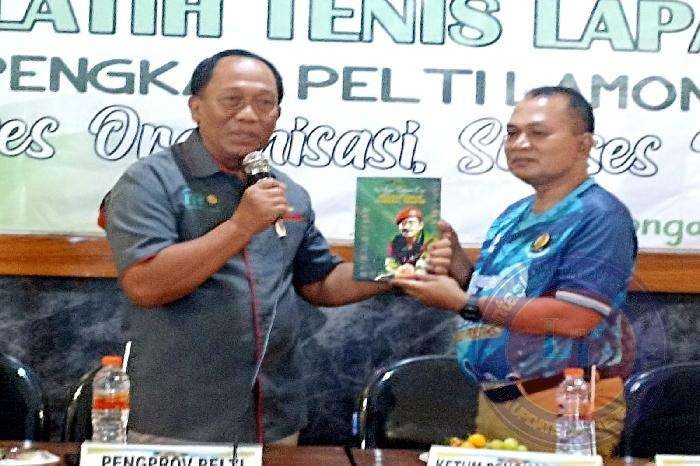 Usai memberi sambutan, Didik memberikan cendramata berupa buku biografi maestro tenis lapangan Widjono Sujono.