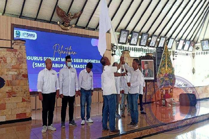 Pelantikan ditandai dengan penyerahan bendera pataka dan SK pengurus SMSI Magetan oleh Sokip Wakil Ketua SMSI Provinsi Jawa Timur kepada Ketua SMSI Magetan, Rendro Sunarjono.