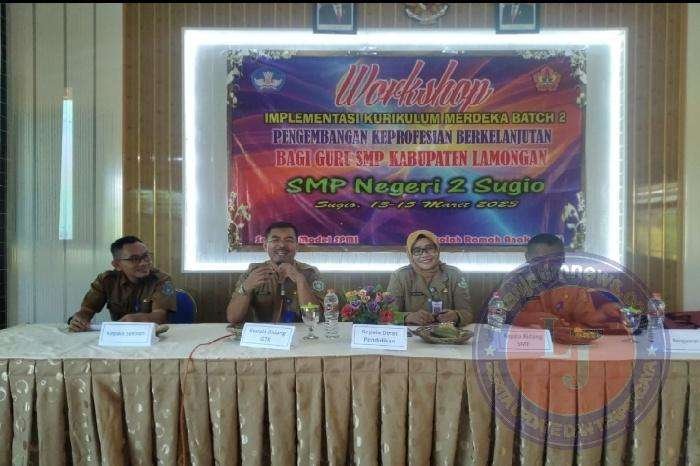 LAMONGAN lintasjatimnews.com – Sri Utami SPd MPd Kepala Bidang (Kabid) Guru Tenaga Kependidikan (GTK) Dinas Pendidikan Kabupaten Lamongan , membuka acara Workshop Implementasi Kurikulum Merdeka Batch 2 Pengembangan Keprofesian Berkelanjutan Bagi Guru SMP Kabupaten Lamongan di SMPN 2 Sugio