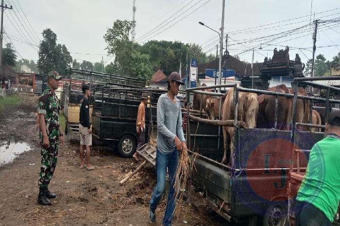 Seperti hari ini, Sertu Budiono, anggota Koramil Tipe B 0802/16 Jetis bersama anggota dari Polsek Jetis, Dinas Peternakan, Pol PP, BPBD serta DISHUB Kabupaten Ponorogo melaksanakan kegiatan pengawasan, pemeriksaan, penyemprotan hewan ternak berkuku belah (Sapi, Kambing) di Pasar Hewan Kecamatan Jetis, Kabupaten Ponorogo, Rabu (22/03/2023).