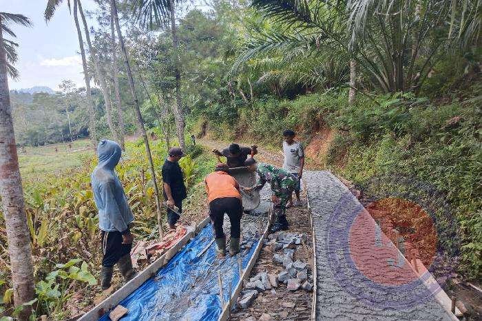 Serma Dodi Winarko bersama warga bahu membahu dan bergotong royong melakukan kerja bakti rabat jalan yang menghubungkan antara Dukuh Krajan dengan Dukuh Sobo, Desa Selur agar kondisi jalan tidak licin dan berlumpur saat musim hujan sehingga mudah dilalui para pengguna.