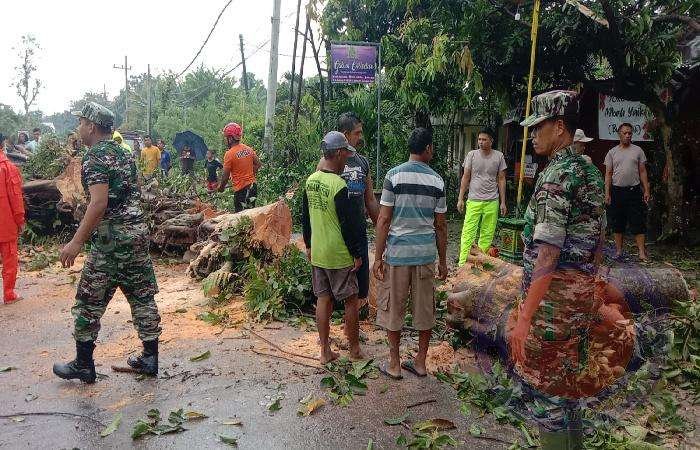 Anggota bersama BPBD dan unsur terkait segera ke lokasi kejadian untuk gotong royong menyingkirkan pohon tumbang tersebut,”ujar Kapten Kasi.