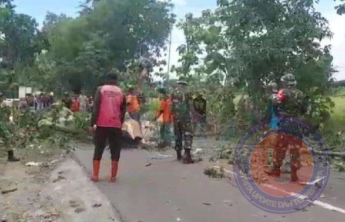 Dari pada roboh saat terjadi hujan lebat dan angin kencang serta bisa membahayakan warga maka pohon harus ditebang ucap Serka Sugeng anggota Koramil Paron yang ikut dalam kegiatan tersebut.