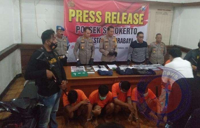 Siti dan suaminya dihadirkan diruang rilis mapolsek Simokerto bersama 3 orang kawanan pencurian kendaraan bermotor yang ditetapkan sebagai tersangka.