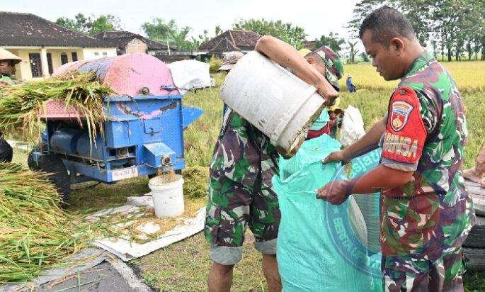 Tampak para anggota Kodim 0726/Sukoharjo antusias dalam membantu petani melaksanakan panen raya ini berogotong-royong bersama warga.