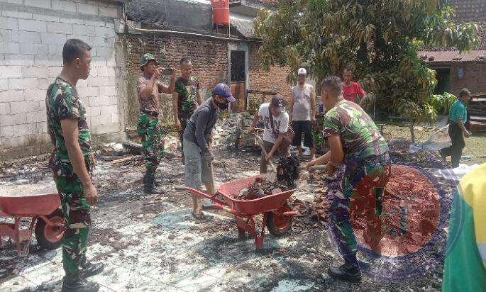 Anggota Koramil 01/Ngawi Melaksanakan Karya Bakti Bantu Bersihkan puing-puing Sisa Kebakaran Rumah Warga