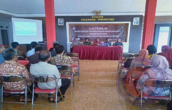 WONOGIRI lintasjatimnews.com – Kegiatan Uji Publik masukan dan tanggapan masyarakat terhadap Daftar Pemilih Sementara (DPS) dan sosialisasi tahapan pemilu 2024 digelar Jum’at (28/4/24), yang bertempat di Pendopo Kecamatan Wuryantoro.