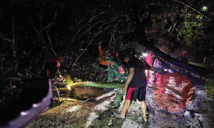 NGAWI lintasjatimnews.com – Hujan lebat yang di sertai angin kencang yang terjadi di wilayah Kecamatan Paron pada malam hari mengakibatkan pohon tumbang dan menutupi jalan, agar jalan segera bisa di lalui Anggota Koramil 02/Paron bersama relawan, dan masyarakat langsung melaksanakan pembersihan, Rabu (03/05/2023) malam.