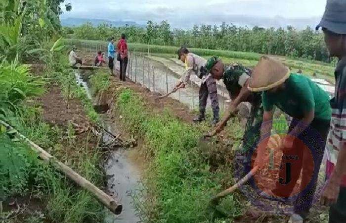 Wujudkan Sinergitas, Babinsa Kodim 0802/Ponorogo dan Bhabinkamtibmas Gotong Royong Bersihkan Saluran Irigasi Bersama Warga