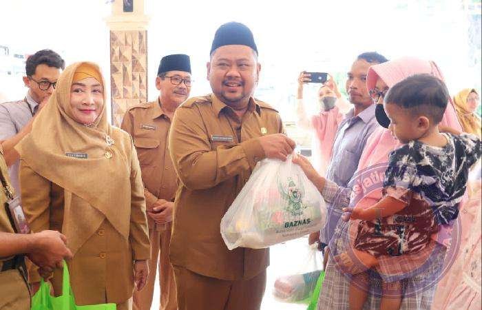 Bupati Gresik Gus Yani secara simbolis menyalurkan bantuan cadangan pangan nasional kepada keluarga penerima manfaat.