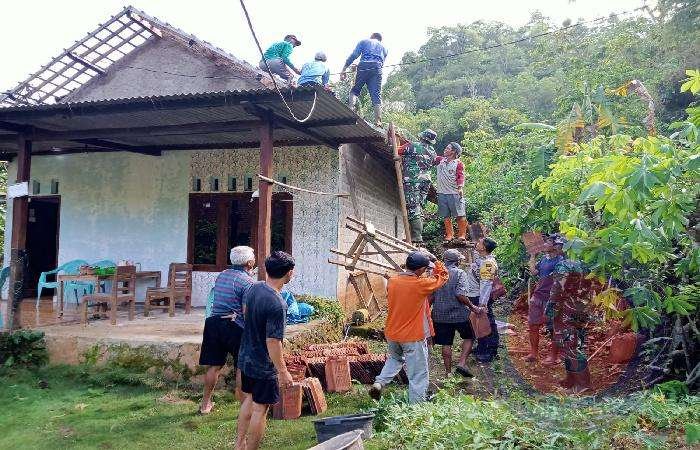 Sebagai upaya penanggulangan bencana alam, Serka Rohmad Babinsa Koramil 0801/11 Donorojo beserta Bhabinkamtibmas dibantu warga setempat melakukan pendataan dan bergotong royong memperbaiki atap rumah yang rusak akibat di terjang angin puting beliung.