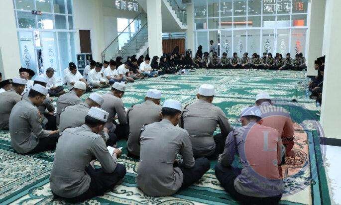 Saat azan magrib berkumandang, rombongan dan tamu undangan melaksanakan Shalat Magrib berjamaah di Masjid Al – Aziz Polres Gresik.