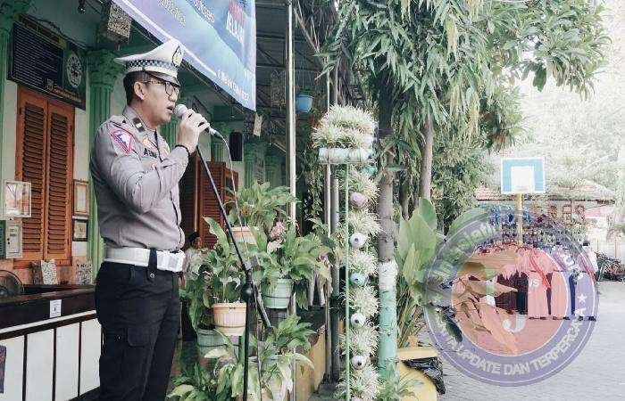 Unit Kamsel Satlantas Polres Gresik melaksanakan kegiatan sosialisasi tata tertib dan etika berlalu lintas di SMPN 2 Gresik, Selasa (23-05-2023).