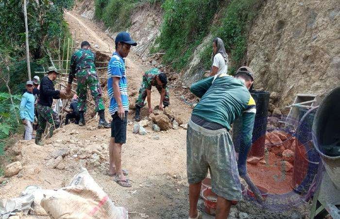 Meskipun berada di bawah terik matahari yang panas, dengan tanpa mengenal lelah mereka saling bahu membahu bersama masyarakat melakukan pembangunan talud sebagai penahan badan jalan agar tidak longsor.