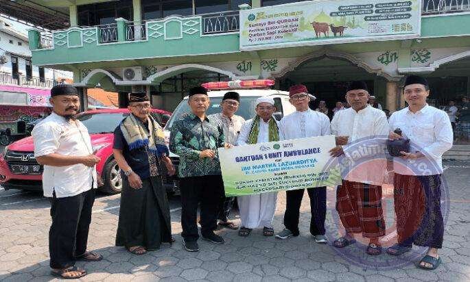 H. Soeharto, mewakili Keluarga Besar CV Cahaya Abadi Mobil, menyerahkan satu unit mobil ambulance ke Rukem Takmir masjid SSNR, usai salat Jumat (9/6/2023) di halaman masjid.