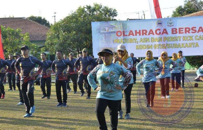 SURAKARTA lintasjatimnews.com – Prajurit dan PNS Kodim 0735/Surakarta beserta Persit KCK Cabang L Dim 0735/Surakarta Koorcab Rem 074/Warastratama menggelar senam bersama dan jalan sehat bertempat di lapangan Apel Makodim, Jln. A Yani No.349, Kelurahan Kerten Kecamatan Laweyan, Rabu (21/06/2023)
