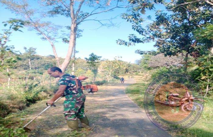 Dengan penuh semangat, Serda Agus hariyadi membantu warga memotong rumput yang ada di kanan dan kiri sepanjang jalan desa menggunakan mesin pemotong rumput sehingga bisa lebih cepat dan maksimal dalam kerja bakti tersebut.