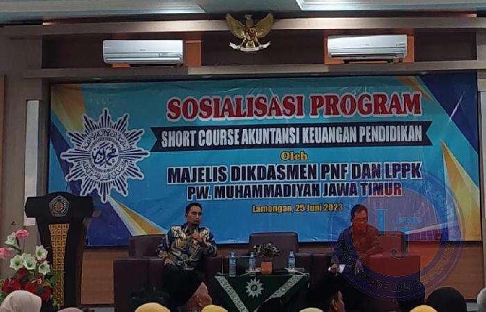Sosialisasi program short course akuntansi keuangan pendidikan ini bertempat di auditorium Budi Utomo Universitas Muhammadiyah Lamongan juga dihadiri Dr. Khozin, M.Si Ketua Majelis Pendidikan Dasar Menengah dan Pendidikan Non Formal PWM Jawa Timur