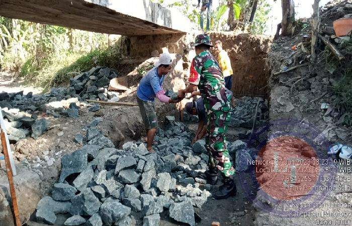 PONOROGO lintasjatimnews.com – Serda Puspitoko, anggota Koramil Tipe B 0802/20 Jambon, Kodim 0802/Ponorogo yang bertugas sebagai Bintara Pembina Desa (Babinsa) Srandil hari ini turut melaksanakan kerja bakti pelebaran jembatan bersama warga Desa Srandil, Kecamatan Jambon, Kabupaten Ponorogo, Selasa (27/06/2023).