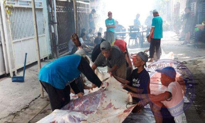 Hewan qurban yang sudah diamanahkan di sembelih dengan membaca takbir bersama-sama, warga dan jama’ah tua muda berkumpul guyub mensukseskan acara tersebut.