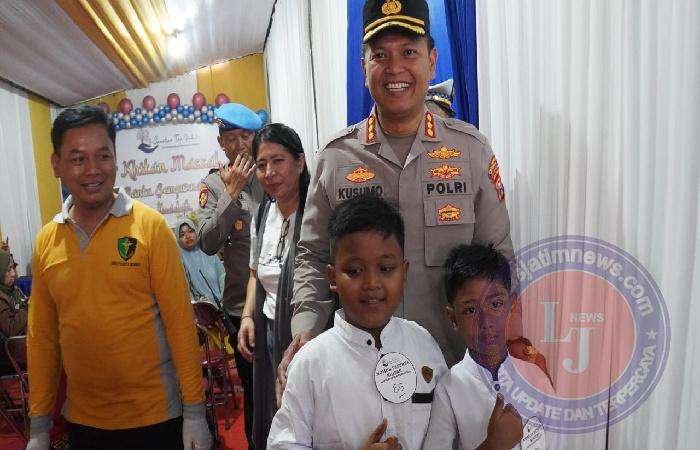 Kapolresta Sidoarjo Komisaris Besar Polisi Kusumo Wahyu Bintoro, hadir meninjau langsung pelaksanaan khitan massal ceria. Serta menyerahkan bingkisan kepada para peserta khitan.