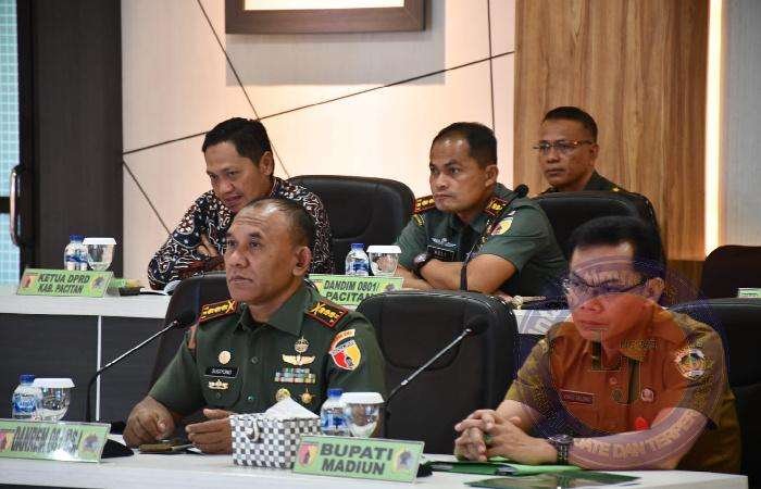 Kali Komandan Kodim 0801/Pacitan Letkol Inf. Roliyanto S.I.P.,M.I.P bersama Danrem 081/DSJ Kolonel H. Sugiyono serta Dandim jajaran Korem 081/Daj yang akan melaksanakan TNI Manunggal Membangun Desa (TMMD) Ke-117 mengikuti Rapat Koordinasi Teknis (Rakornis) Pelaksanaan TNI Manunggal Membangun Desa (TMMD) Ke-117 Tahun Anggaran 2023 yang dilaksanakan secara Virtual Di Ruang Command Center Makorem, Jalan Pahlawan No. 50, Kota Madiun, Jawa Timur.