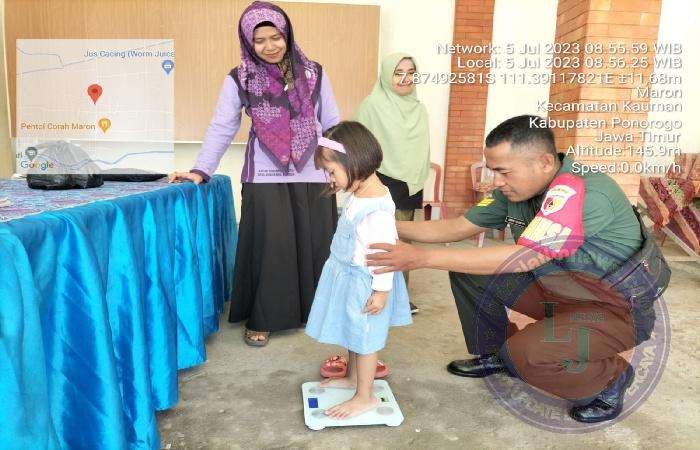 PONOROGO lintasjatimnews.com – Mengetahui di wilayah desa binaan ada kegiatan Posyandu Balita, Serka Umar Sujatiyo, anggota Koramil Tipe B 0802/05 Kauman, Kodim 0802/Ponorogo yang bertugas menjadi Bintara Pembina Desa (Babinsa) Maron langsung datang ke Balai Desa, Maron, Kecamatan Kauman, Kabupaten Ponorogo, Rabu (05/07/2023).