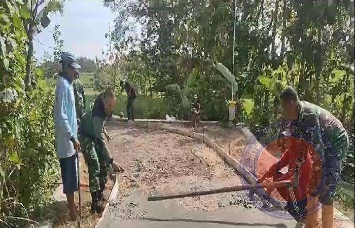 Dengan menggunakan mesin molen dan berbagai alat pertukangan, anggota Koramil Tipe B 0802/08 Sampung, Kodim 0802/Ponorogo bersama warga secara bergotong royong melakukan pengecoran jalan sesuai target waktu yang telah disepakati.