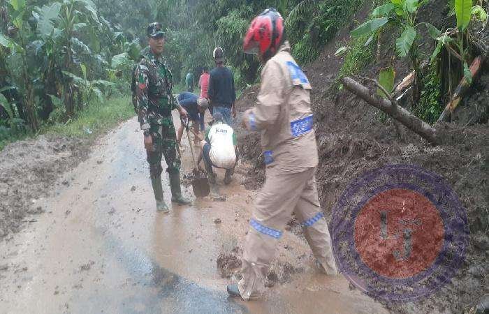 Material tanah longsor yang terjadi pukul 06.00 tersebut, cukup menumpuk hingga ketinggaian 50 Centimeter.