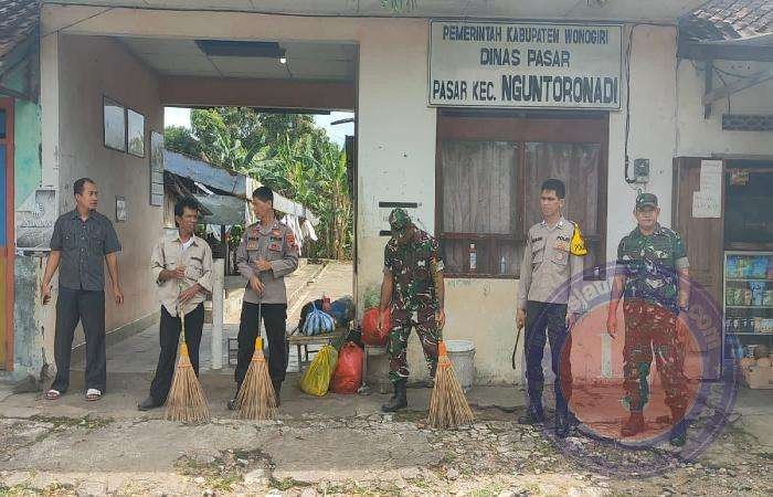WONOGIRI lintasjatimnews.com – Kegiatan peduli lingkungan ditunjukkan oleh TNI-Polri dari Koramil 04/Nguntoronadi dan Polsek Nguntoronadi, dengan melaksanakan karya bakti pembersihan disekitaran lingkungan Pasar Inpres yang berada di Kelurahan Kedungrejo, Sabtu(15/7/23).