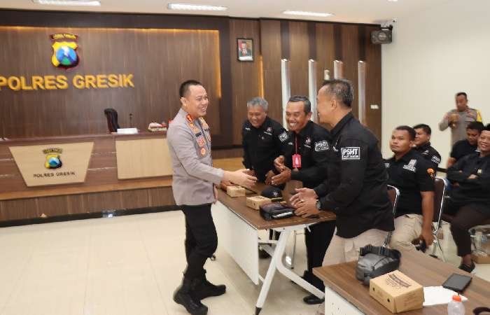 GRESIK lintasjatimnews.com – Kapolres Gresik AKBP Adhitya Panji Anom beserta jajaran menggelar rapat koordinasi Pengesahan Warga PSHT Cabang Gresik di Padepokan Asem Pandan Cerme. Rakor digelar di Aula Rupatama Sarja Arya Racana Polres Gresik, Selasa (18-7-2023).