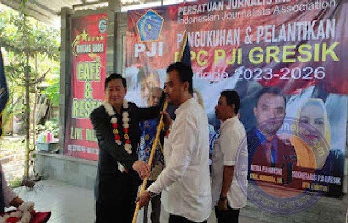 Prosesi pelantikan penyerahan Bendera Pataka PJI, penyerahan SK (Surat Keputusan) beserta Piagam Pataka/SK, penyerahan stempel PJI dan Piagam Pakta Integritas oleh Ketua Umum PJI, Hartanto Boechori kepada M. Iqbal Nurindra S.H untuk dikibarkan di seluruh Kabupaten Gresik menjadi simbol pengukuhan M Iqbal Nurindra S.H sebagai Ketua DPC PJI Gresik periode 2023-2026 pada Minggu 23 Juli 2023.