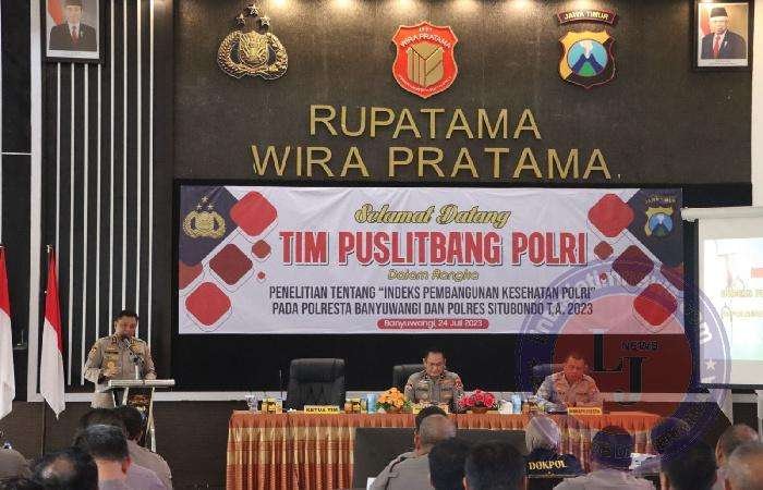 BANYUWANGI lintasjatimnews.com – Dalam rangka Penelitian tentang Indek Pembangunan Kesehatan Polri pada Polresta Banyuwangi dan Polres Situbondo Tahun Anggaran 2023, dilaksanakan kegiatan Team Puslitbang di gedung Rupatama Polresta Banyuwangi, Senin (24/7/2023).