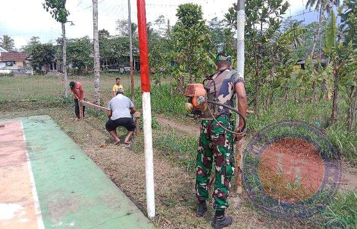 Bersama dengan warga Dusun Gudeng Desa Segaran Kecamatan Tiris kami bersinergi gotong royong membersihkan rumput liar di area lapangan bola voli, kata Serma Ismail.