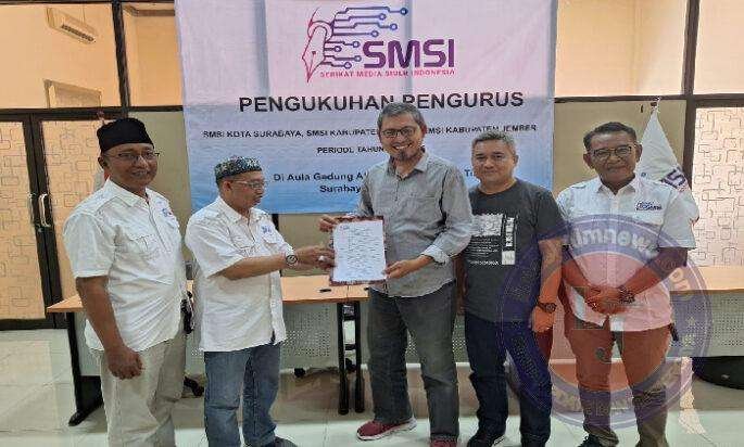 SURABAYA lintasjatimnews.com – Ketua Serikat Media Siber Indonesia (SMSI) Provinsi Jawa Timur mengukuhkan tiga kepengurusan, pada SMSI Kota Surabaya, SMSI Kabupaten Gresik dan SMSI Kabupaten Jember di Aula A. Aziz kantor PWI Jawa Timur, Jalan Taman Apsari No. 15-17 Kota Surabaya, Jumat (28/7/2023).
