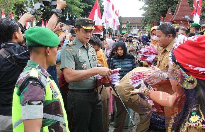 Dandim 0806/Trenggalek, Letkol Kav Peddy Adi Prasetyo, S.Sos, beserta Forkopimda dan tokoh masyarakat, turut hadir menyaksikan momen bersejarah ini di Pendapa Manggala Praja Nugraha Trenggalek. Sebanyak 20 ribu bendera merah putih berkibar gagah, membawa inspirasi bagi masa depan bangsa, Senin (31/7/2023).