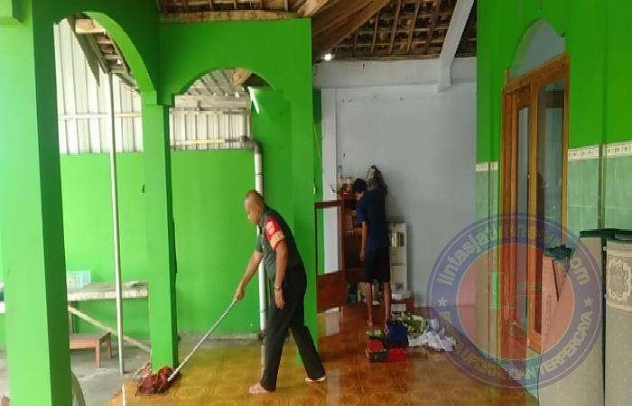 Mulai dari membersihkan halaman masjid, sampah-sampah yang berada disekitaran masjid, pengepelan, tempat wudhu, kamar mandi dan bagian atap masjid.
