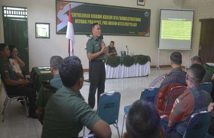 Dandim 0724/Boyolali Letkol Inf Wiweko Wulang Widodo S.Pd. M. Han, dalam sambutannya menyampaikan penyuluhan hukum merupakan program pembinaan peningkatan personel, utamanya dalam bidang penegakan hukum dalam rangka pembekalan hukum kepada para Prajurit dan PNS Kodim 0724/Boyolali agar selalu tertib dan tidak melakukan pelanggaran hukum.