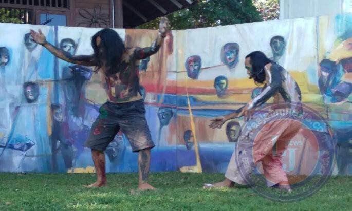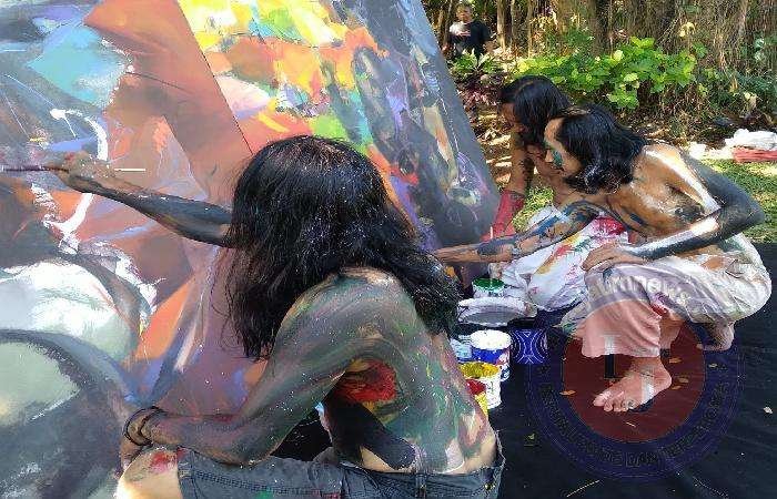 Lambat laun awan menutupi area Dwarakerta sehingga suasana berganti redup dengan semilir angin menambah gairah mereka untuk perform.. Ketiga perupa Sidoarjo, S. Wandhi, Ali Topan dan Dayak Tato terus melanjutkan aksinya menyelesaikan lukisan abstrak. Terdengar alunan musik terus mengiringi hingga lukisan tampak bentuk abstrak. Tampil pula penari Ujik ikut ambil bagian menari di area lukisan dengan latar gapura Dwarakerta.