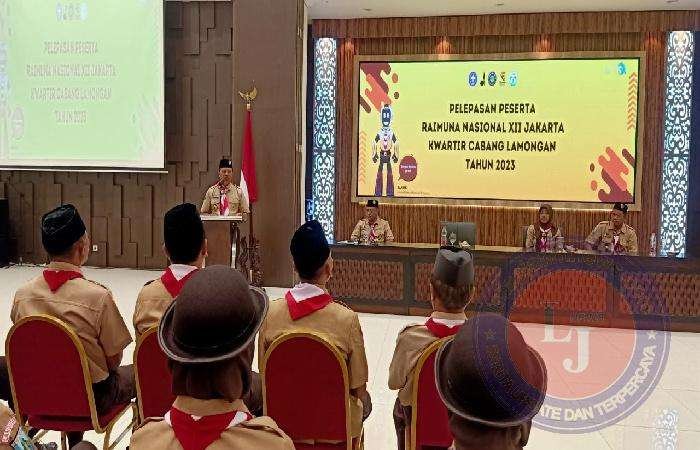 Upacara pelepasan peserta Raimuna bertempat di Aula Gajah Mada lantai 7 Kantor Pemerintah Daerah Lamongan, hari Sabtu (12/8/2023) diikuti 32 peserta. Hadir dalam acara Ketua Kwarcab Lamongan (Drs. H. Nalikan, MM.), Sekretaris Kwarcab (A. H. Farih, SH. MM.), jajaran pengurus Kwarcab, Pembina, dan wali peserta didik.