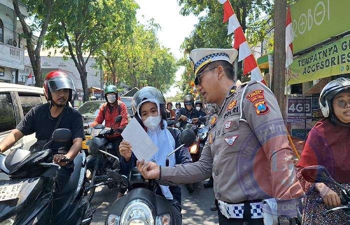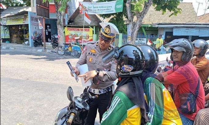 Kanit Kamsel Satlantas Polres Gresik Ipda Muhammad Azmy bersama anggota membagikan kepada para pengguna jalan. Sosialisasi ini dilakukan kepada pengguna jalan yang melintas di Jalan Raya Panglima Sudirmam, Jalan Raya Veteran, Kecamatan Kebomas, Kabupaten Gresik.