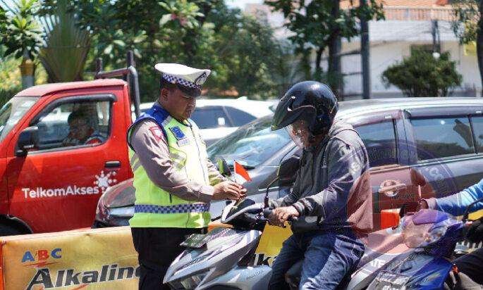Satlantas Polrestabes Surabaya Bagikan Bendera Merah Putih ke Pengguna Jalan