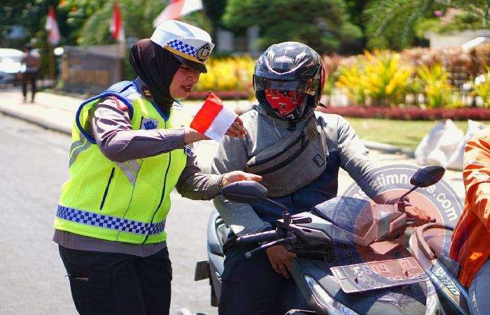 Satlantas Polrestabes Surabaya Bagikan Bendera Merah Putih ke Pengguna Jalan