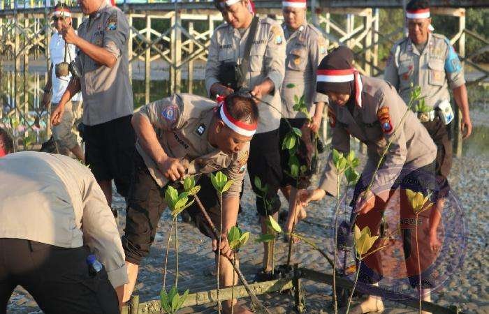 Kegiatan penanaman pohon mangrove tersebut juga dilakukan serentak di seluruh Indonesia oleh anggota Polri.
