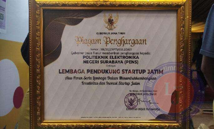 Politeknik Elektronika Negeri Surabaya (PENS) menerima penghargaan sebagai Lembaga Pendukung Startup Jatim (20/09/2023).
