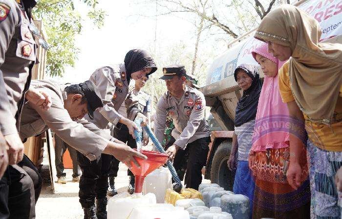 PONOROGO lintasjatimnews.com – Kekeringan mulai melanda disejumlah wilayah Ponorogo. Kali ini, Polwan Polres Ponorogo menggandeng TNI, BPBD dan Perhutani kembali menyalurkan bantuan dengan Droping air bersih di Jalan Tirto, Panguripan Desa Duri, Kecamatan Slahung, Ponorogo, Kamis (21/9/2023)